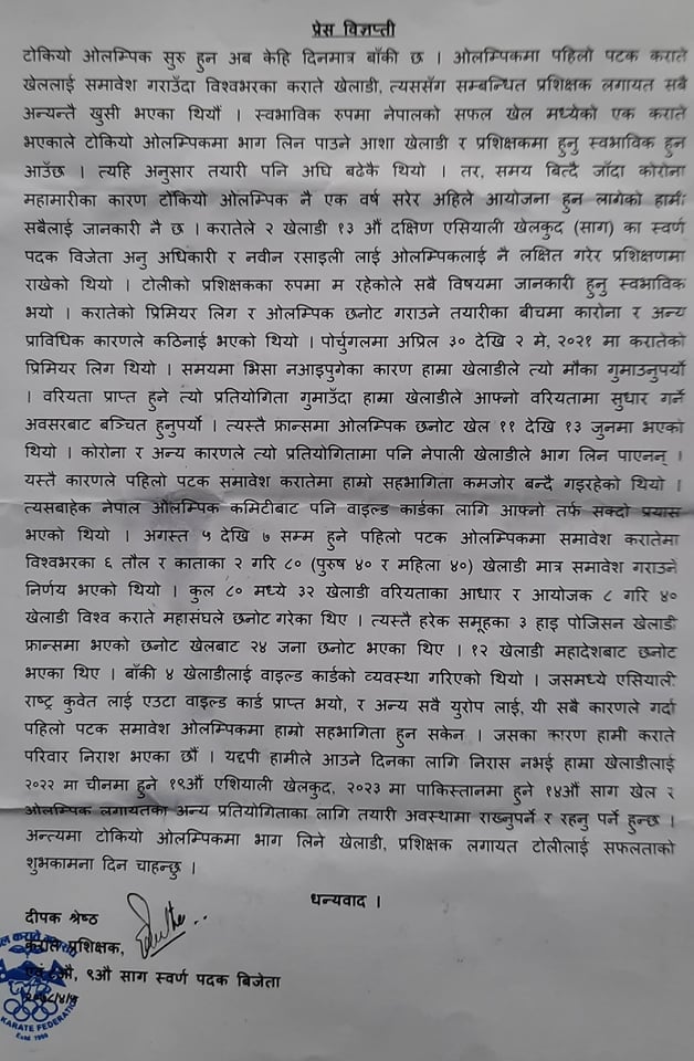 ‘पोर्चुगलमा अप्रिल ३० देखि २ मे करातेको प्रिमियर लिग थियो । समयमा भिसा नआइपुगेका कारण हाम्रा खेलाडीले त्यो मौका गुमाउनुपर्यो । वरियता प्राप्त हुने त्यो प्रतियोगिता गुमाउँदा हाम्रा खेलाडीले आफ्नो वरियतामा सुधार गर्ने अवसरबाट बञ्चित हुनुपर्यो,’ विज्ञप्तीमा भनिएको छ,‘ त्यस्तै फ्रान्समा ओलम्पिक छनोट खेल ११ देखि १३ जुनमा भएको थियो । कोरोना र अन्य कारणले त्यो प्रतियोगितामा पनि नेपाली खेलाडीले भाग लिन पाएनन् । यस्तै कारणले पहिलो पटक समावेश करातेमा हाम्रो सहभागिता कमजोर बन्दै गइरहेको थियो ।’
