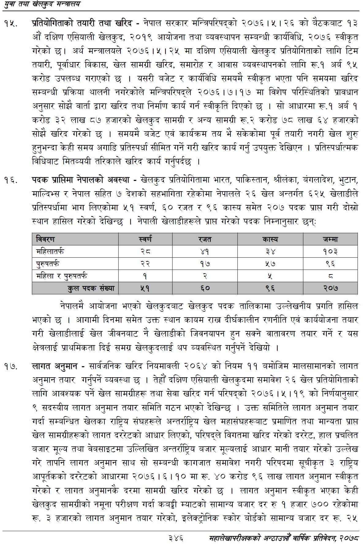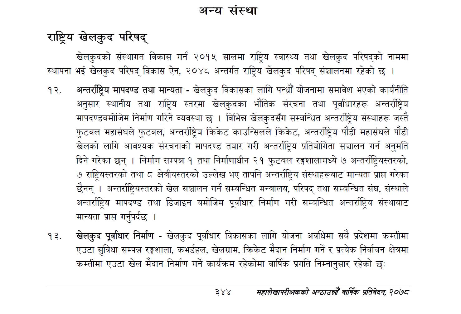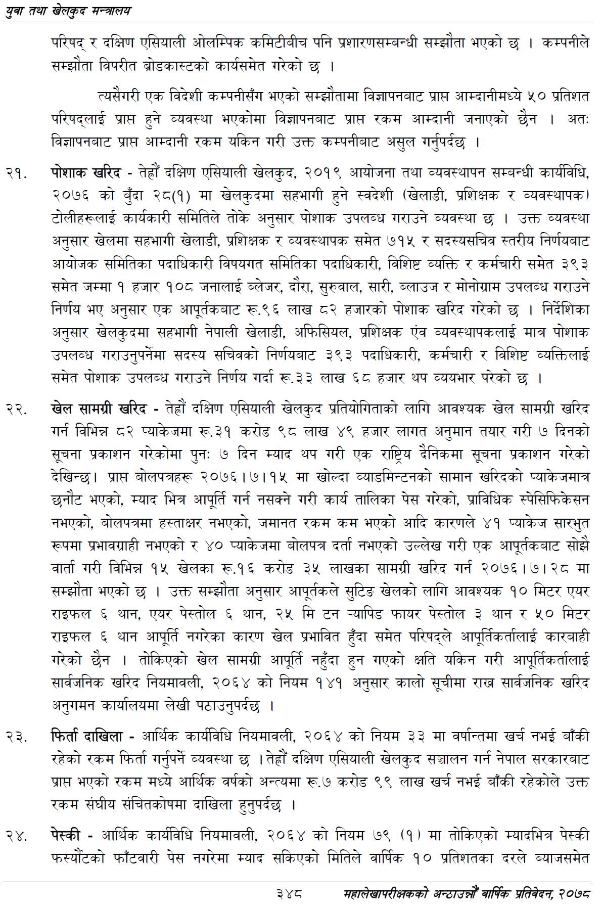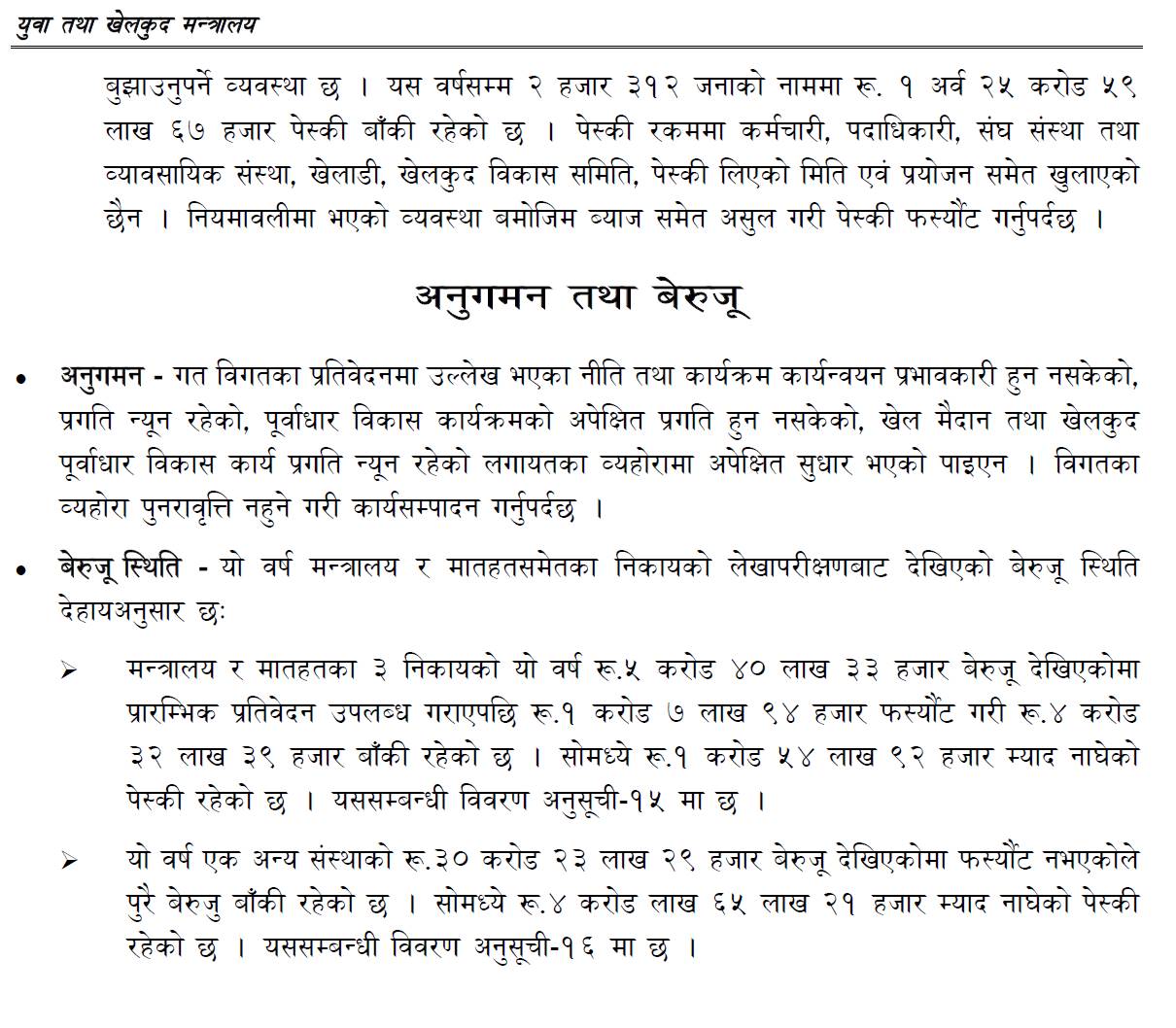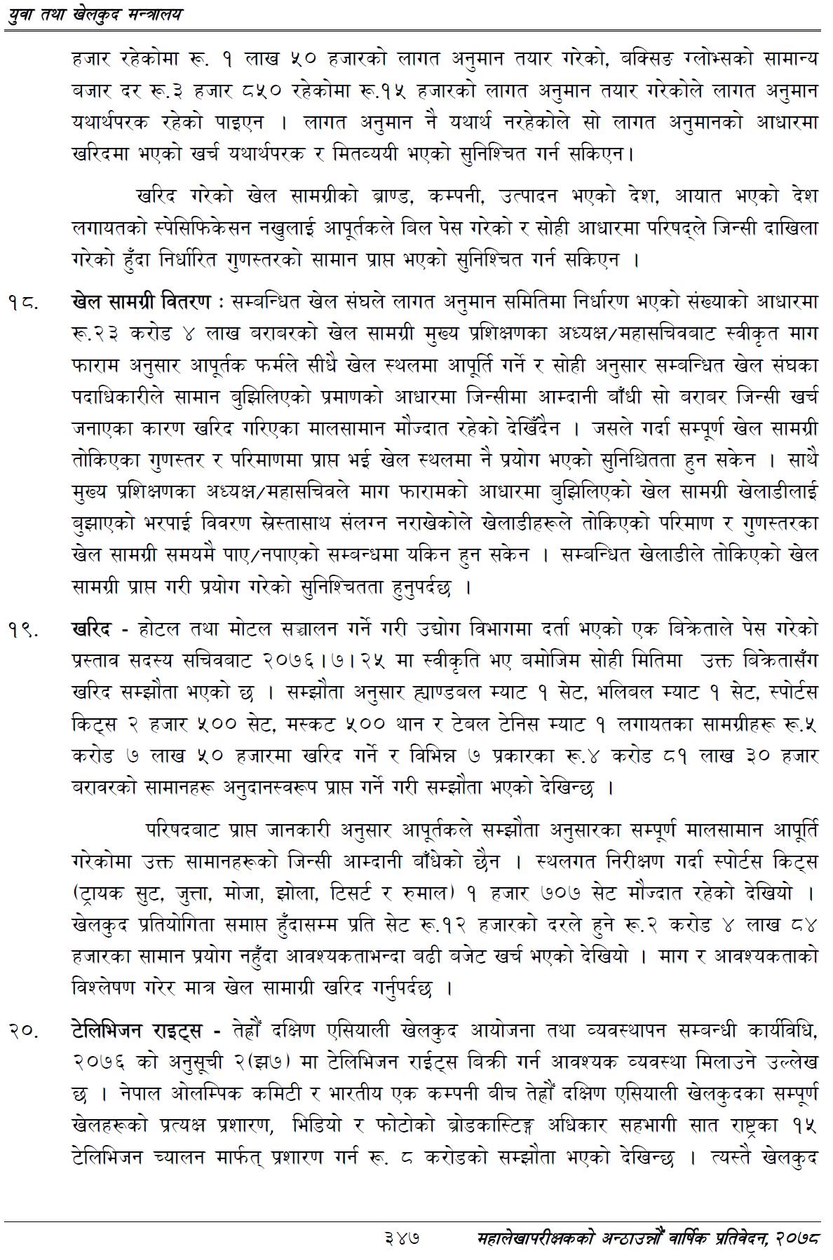 जस अनुसार २ करोड ४ लाख ८४ हजार रुपैयाको समान प्रयोग नहुँदा आवश्यकता भन्दा बढी खर्च भएको देखिएको छ । महालेखाले भनेको छ, माग र आवश्यकताको विश्लेषण गरेर मात्र खेल सामाग्री खरिद गर्नुपर्दछ ।