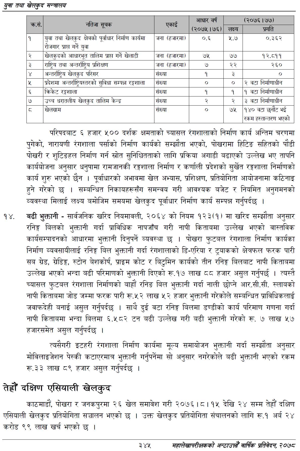 पोखरा फुटबल रंगशाला निर्माणका क्रममा १७ लाख ८८ हजार असुल गर्नुपर्ने महालेखाले ठहर गरेको छ । रंगशाला निर्माण कार्यका निर्माण व्यवसायीलाई रनिङ बिल भुक्तानी गर्दा रंगशालाको डि एसिया र ट्राकको क्षेत्रफर फरक पारी सब ग्रेड, ग्रेडिङ, स्टोन बेशकोर्ष, प्राइम कोट र बिटुमिन कार्यको तीन रनिङ बिलबाट नापी किताबमा उल्लेख भएको भन्दा बढी परिमाणको मुक्ती दिएकोले १७ लाख ८८ हजार असल गुनपर्ने महालेखाले प्रतिवेदनमा उल्लेख गरेको छ ।