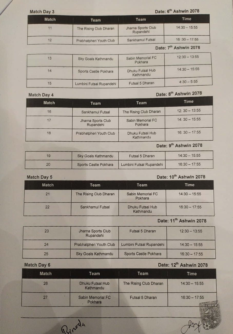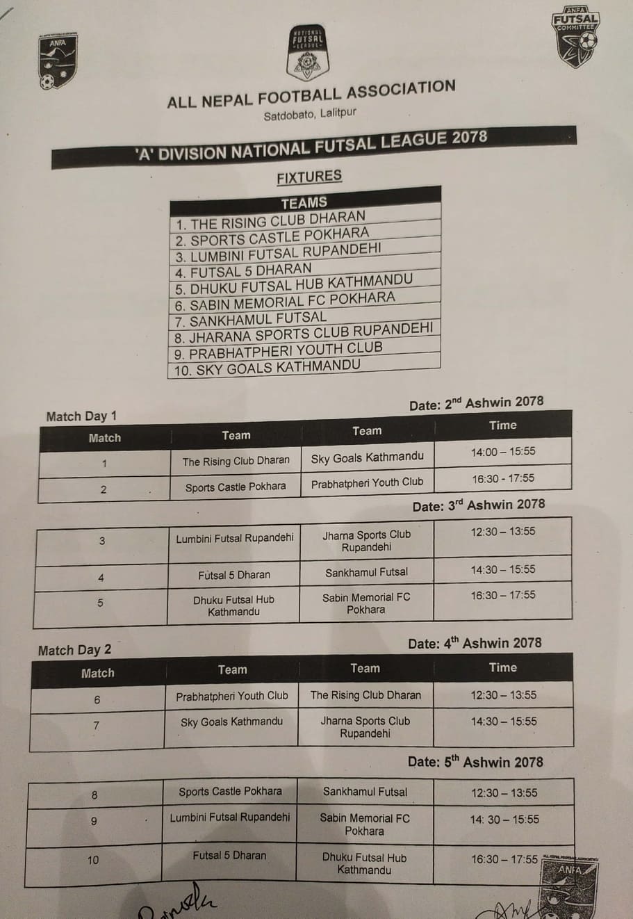 काठमाडौं (हाम्रो खेलकुद) – अर्को महिना पोखरामा आयोजना हुने ‘ए’ डिभिजन राष्ट्रिय फुटसल लिगको उद्घाटन खेल द राइजिङ क्लब धरान र स्काई गोल्स काठमाडौंबीच हुने भएको छ । अखिल नेपाल फुटबल संघ (एन्फा) अन्तरगतको फुटसल कमिटीले मंगलबार खेल तालिका सार्वजनिक गरेको छ ।