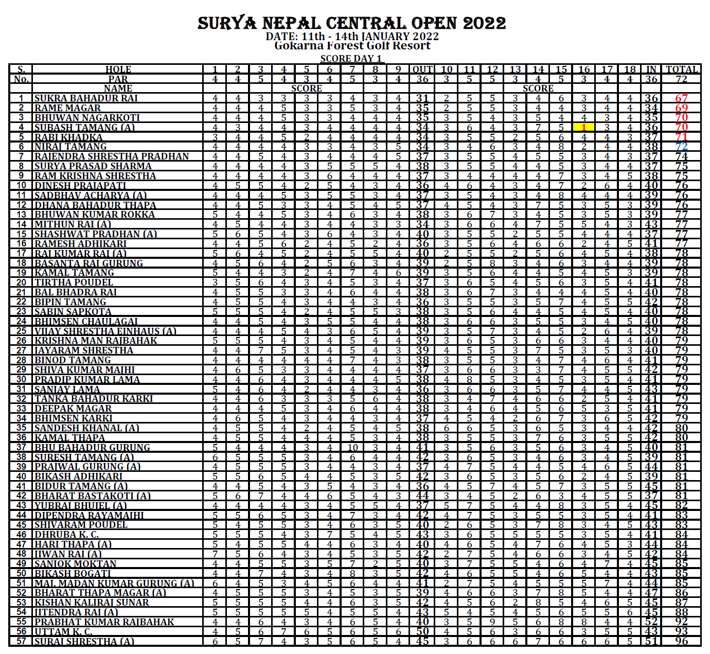 गोकर्ण गल्फ क्लबमा शुक्रले ५ अन्डर ६७ को प्रदर्शन गरेका हुन् । दोस्रो स्थानमा रामे मगर ३ अन्डर ६९ स्कोर जोडेका छन् । त्यस्तै तेस्रो स्थानमा स्थानीय प्रो भुवन नगरकोटी र १३ औं सागका दोहोरो स्वर्ण विजेता सुभाष तामाङ २ अन्डर ७० स्कोरमा छन् । रवि खड्काले १ अन्डर ७१ स्कोर जोड्दा निरज तामाङ इभन पार ७२ खेल्दै छैटौं स्थानमा छन् ।