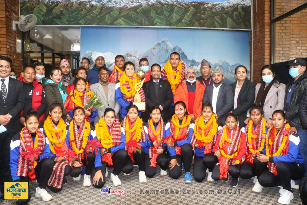 भनिन्छ, जित्नेको इतिहास लेखिन्छ । त्यसअर्थ स्वभाविक थियो महिला टोलीले न्यानो र भव्य स्वागतको हकदार थियो । त्यहि अनुसार युवा तथा खेलकुद मन्त्री महेश्वरजंग गहतराज, पूर्व मन्त्री दलजित श्रीपाइली, भलिबल संघका अध्यक्ष मनोरञ्जनरमण शर्मालगायत भलिबलकर्मीले महिला टोलीलाई स्वागत गरे । त्यसपछि पत्रकार सम्मेलनमा मन्त्री गहतराज, महिला टोलीकी कप्तान अरुणा शाही, प्रशिक्षक जगदिश भट्ट र अध्यक्ष शर्माले आ आफ्नो भनाई राखे ।