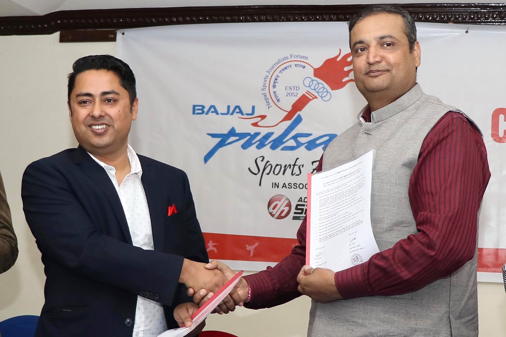 सम्झौतामा नेपाल खेलकुद पत्रकार मञ्चका अध्यक्ष महेश आचार्य र डिस होमका प्रमुख कार्यकारी अधिकृत (सिइओ) सुदिप आचार्यले हस्ताक्षर गरे । सम्झौतासँगै अवार्डको नाम अनुसार डिस होमले ‘एनएसजेएफ पल्सर स्पोर्ट्स अवार्ड २०७४ इन एशोसियसन विथ डिस होम एक्सन स्पोर्टस्’ हुनेछ ।