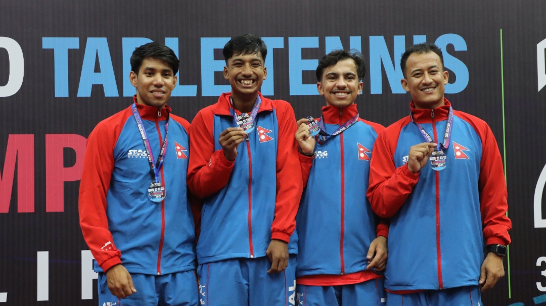 अखिल नेपाल टेबलटेनिस संघद्वारा आयोजित प्रतियोगिताको पुरुषमा नेपाल ७ अंकसाथ नेपाल दोश्रो भयो । भारतसंग मात्र चुकेको नेपालले पहिलो दिन बुधबार श्रीलंकालाई ३–०, माल्दिभ्सलाई ३–१ र बंगलादेशलाई ३–२ को सेटमा पराजित गरेको थियो । माल्दिभ्स र श्रीलंका तेश्रो भए ।
