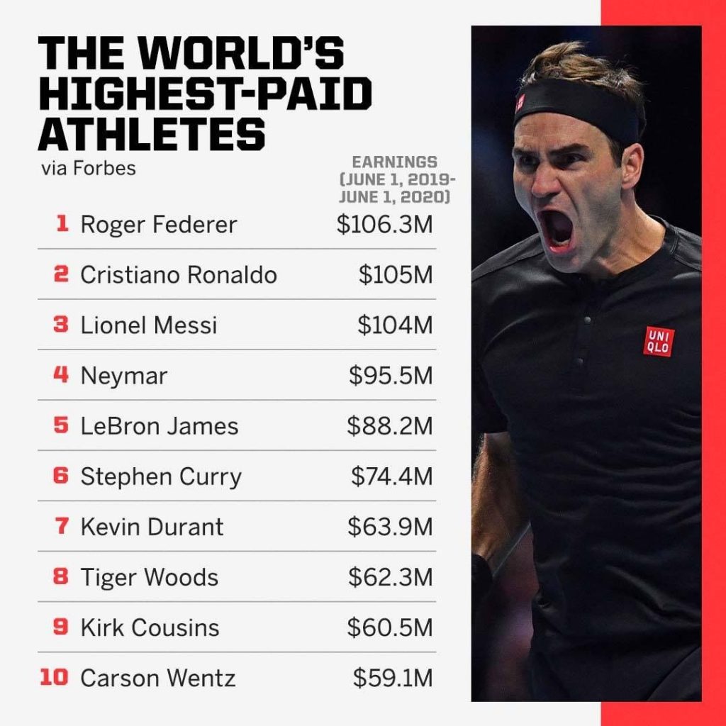 पछिल्लो तथ्यांक अनुसार सर्वाधिक आम्दानी गर्नेको सुचीमा शीर्षस्थानमा उक्लिएका स्वीस टेनिस स्टार फेडेररको आम्दानी १०६.३ मिलियन डलर छ । फेडेररले अधिकांश आम्दानी प्रायोजकबाट हात पारेका हुन् । उनीसँग १३ वटा विभिन्न ब्राण्डहरु प्रायोजकका रुपमा रहेका छन् । यस्तै फेडेरर सक्रिय खेलाडी हुँदै एकै वर्षमा १ सय मिलियन डलर प्रायोजकबाट कमाउने दोस्रो खेलाडी बनेका छन् । यसअघि गल्फका खेलाडी टाइगर उड्सले यो उपलब्धि हासिल गरेका थिए ।