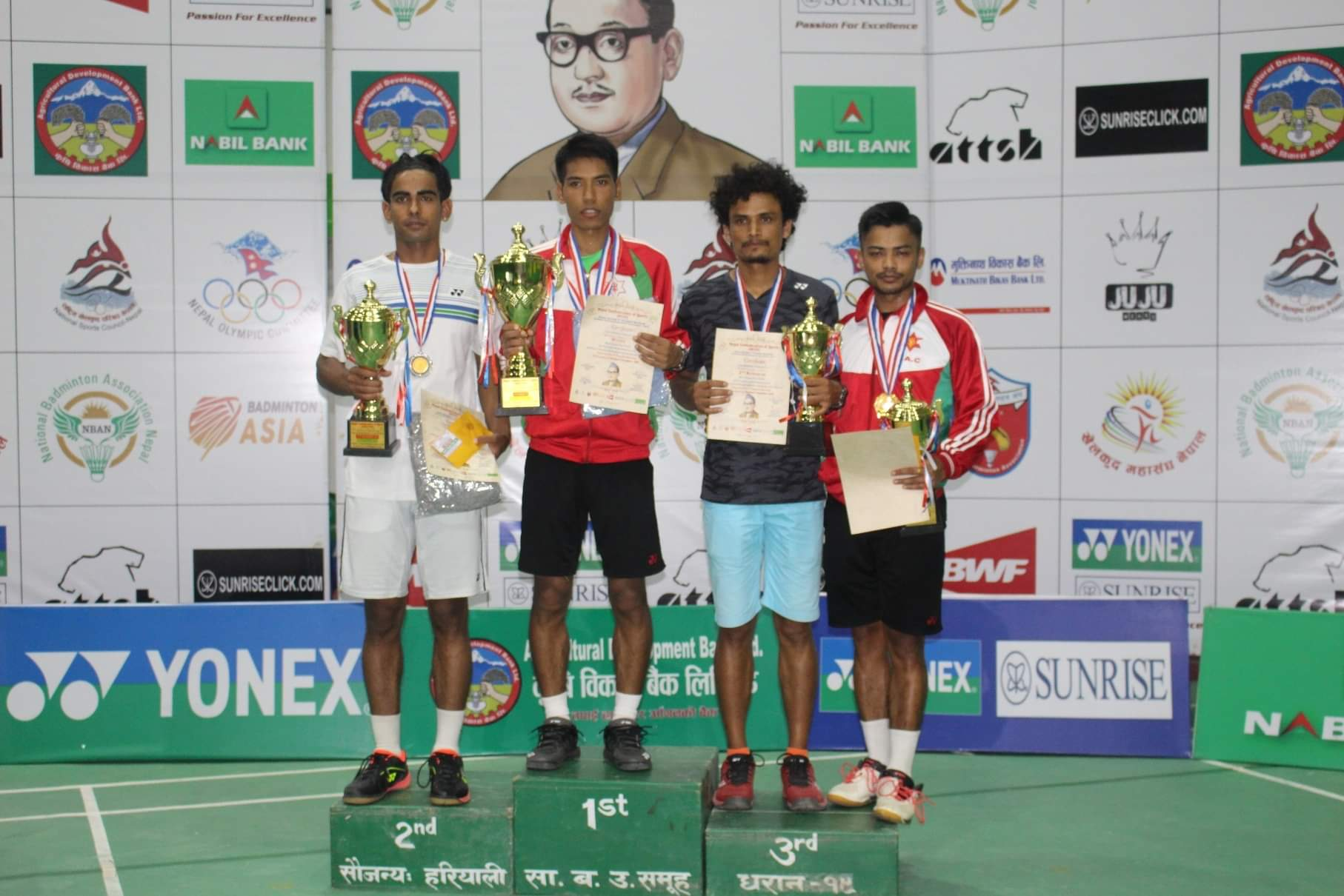ईटहरी रङ्गशालास्थित कभर्डहलमा भएको प्रतियोगिताको पुरुष युगलमा सेनाका रत्नजित तामाङ र नविन श्रेष्ठको जोडीले बाजी मा¥यो । रत्न र नविनको जोडीले एपिएफका दिपेश धामी र विजित थापामगरको जोडीलाई १६–२१, २१–१७ र २१–१२ ले पन्छाउँदै उपाधी जितेको हो । बाँकेका रियाज अन्सारी र ईरफान अन्सारी तथा सेनाका रुकेश महर्जन र प्रफुल महर्जनको जोडी तेस्रो भयो ।