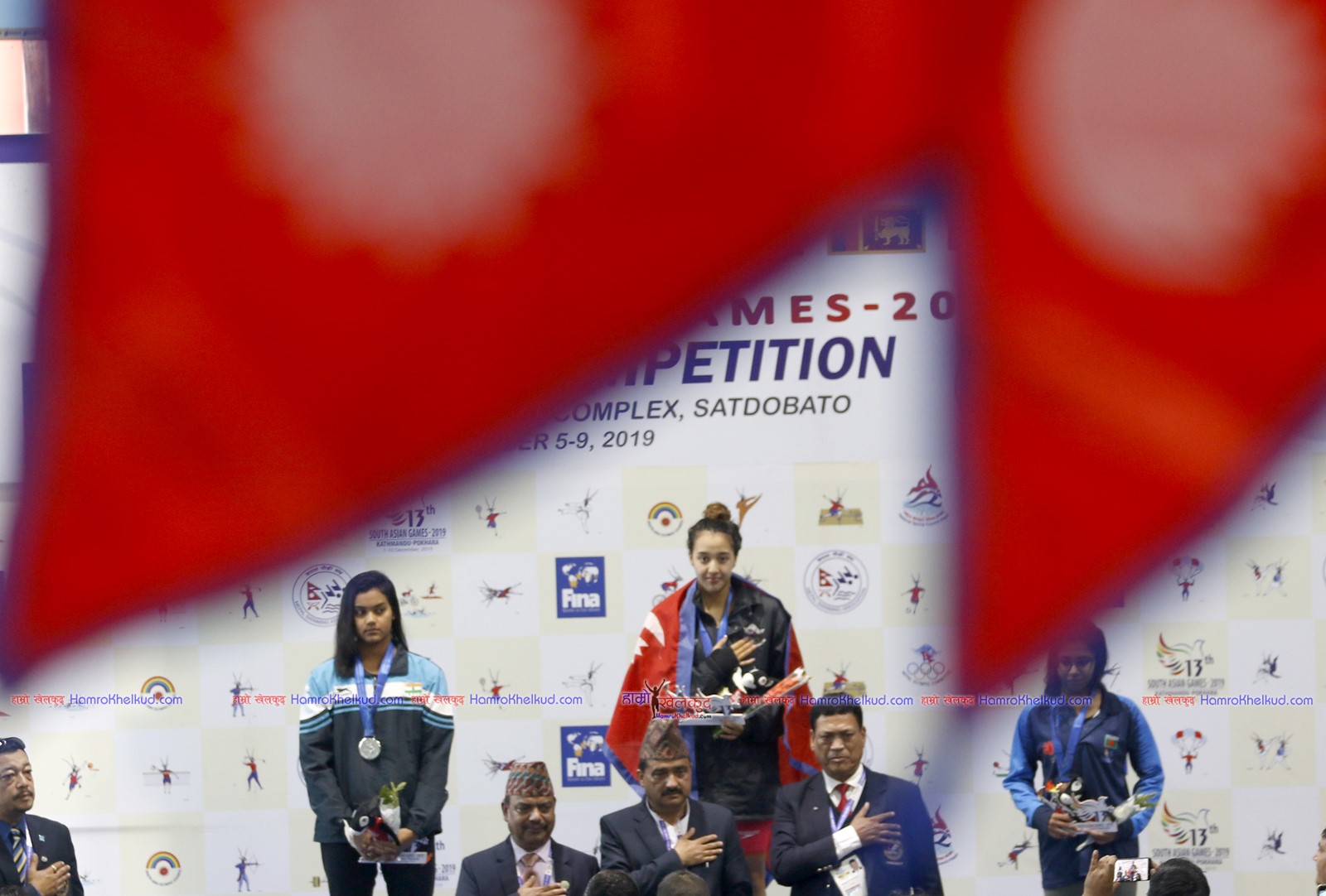 काठमाडौं (हाम्रो खेलकुद) – पौडीकी गौरिका सिंहले १३ औं दक्षिण एसियाली खेलकुद( साग) अन्तर्गत बिहीबार २ सय मिटर फ्रिस्टाइलमा स्वर्ण जित्दै इतिहास कायम गरिन् । नेपालका लागि पौडीतर्फ एकल विधामा पहिलो स्वर्ण जितेकी उनले पदक नेपाललाई समर्पण गरिन् ।