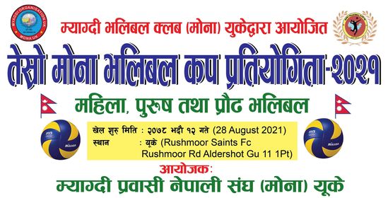म्याग्दी प्रवासी नेपाली संघ (मोना) यूकेको आयोजना र मोना भलिबल क्लबको संयोजकत्वमा सम्पन्न हुने प्रतियोगिता रस्मुर सेन्ट्स फुटबल क्लब अल्डरसटमा हुनेछ । प्रतियोगितामा पुरुष, महिला र प्रौढ भलिबल प्रतियोगितामा प्रतिस्पर्धा हुने मोना युकेका अध्यक्ष दल जुग्जालीले जानकारी दिए ।
